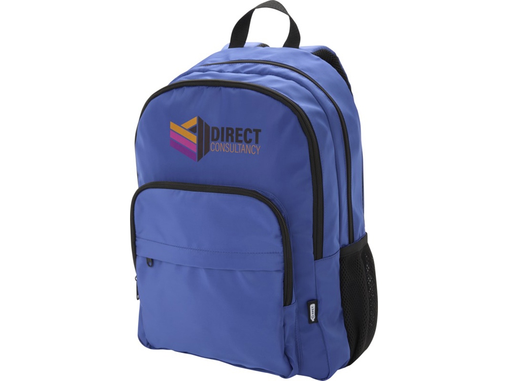 Рюкзак Trend Plus изготовлен из сертифицированной согласно GRS переработанной мягкой и немнущейся ткани и качественной подкладки из RPET. Рюкзак оснащен отделением для ноутбука диагональю 15, отделением-органайзером, передними карманами на молнии, боковыми эластичными сетчатыми карманами и сетчатой вентилируемой задней частью с лямкой для крепления к ручке чемодана. Регулируемые плечевые ремни для оптимального комфорта при ношении. Объем: 20 литр. Выдерживает вес до 10 кг. Не содержит ПВХ. GRS certified recycled polyester.