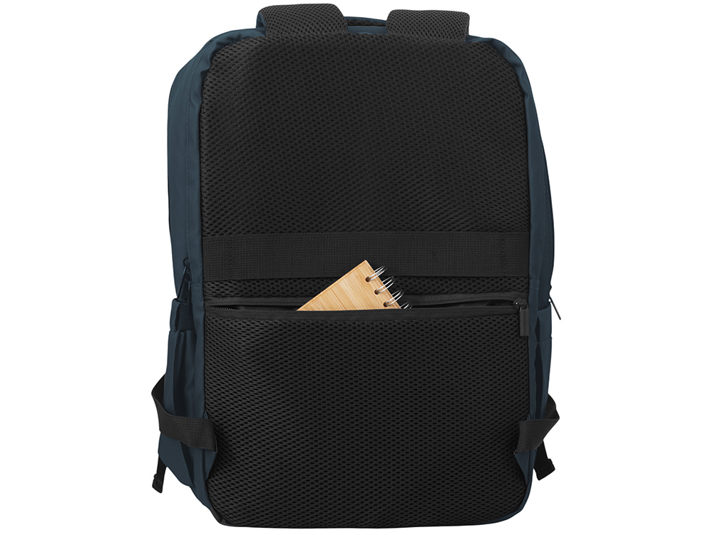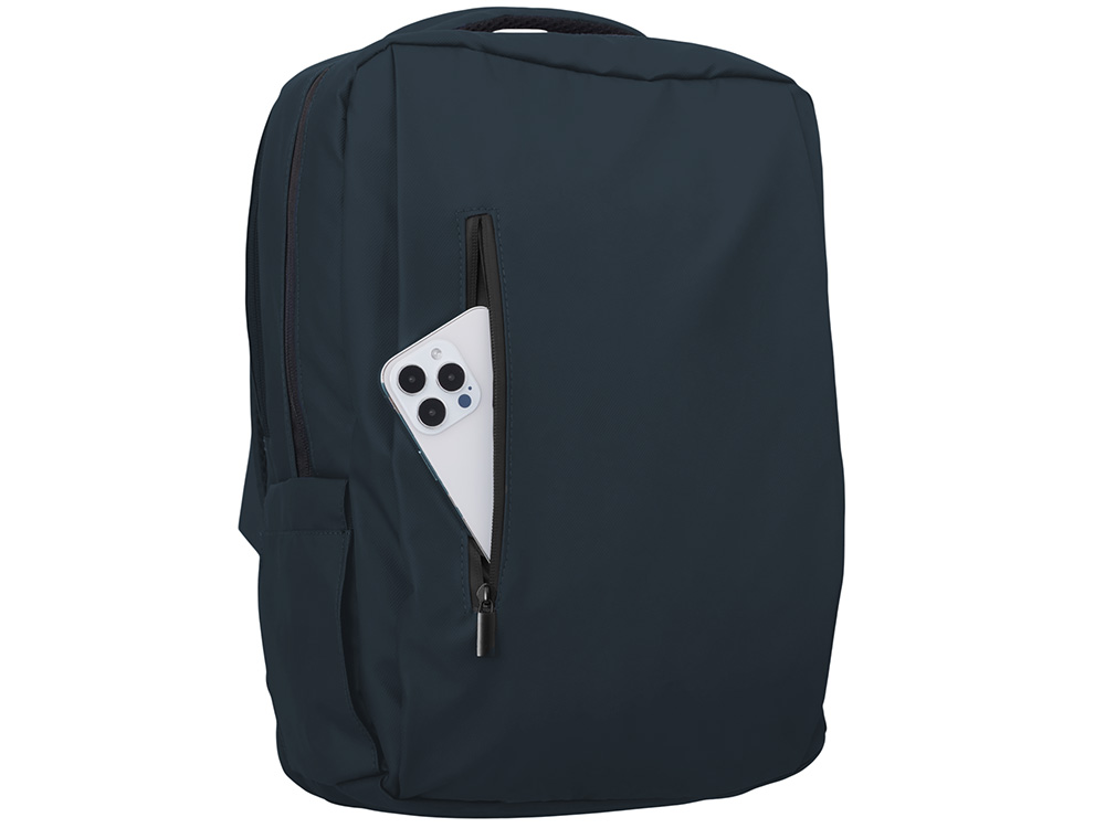Непромокаемый бизнес рюкзак с двумя вместительными отделениями и карманом на молнии спереди. В одном отделении расположены карман для ноутбука и планшета, в другом органайзер и много пространства для одежды и других вещей на случай деловой поездки. На сетчатой спинке расположен потайной кармана на молнии для документов и личных вещей и ремень для крепления на ручку чемодана. Сверху удобная мягкая ручка для переноски. Лямки регулируются по длине.