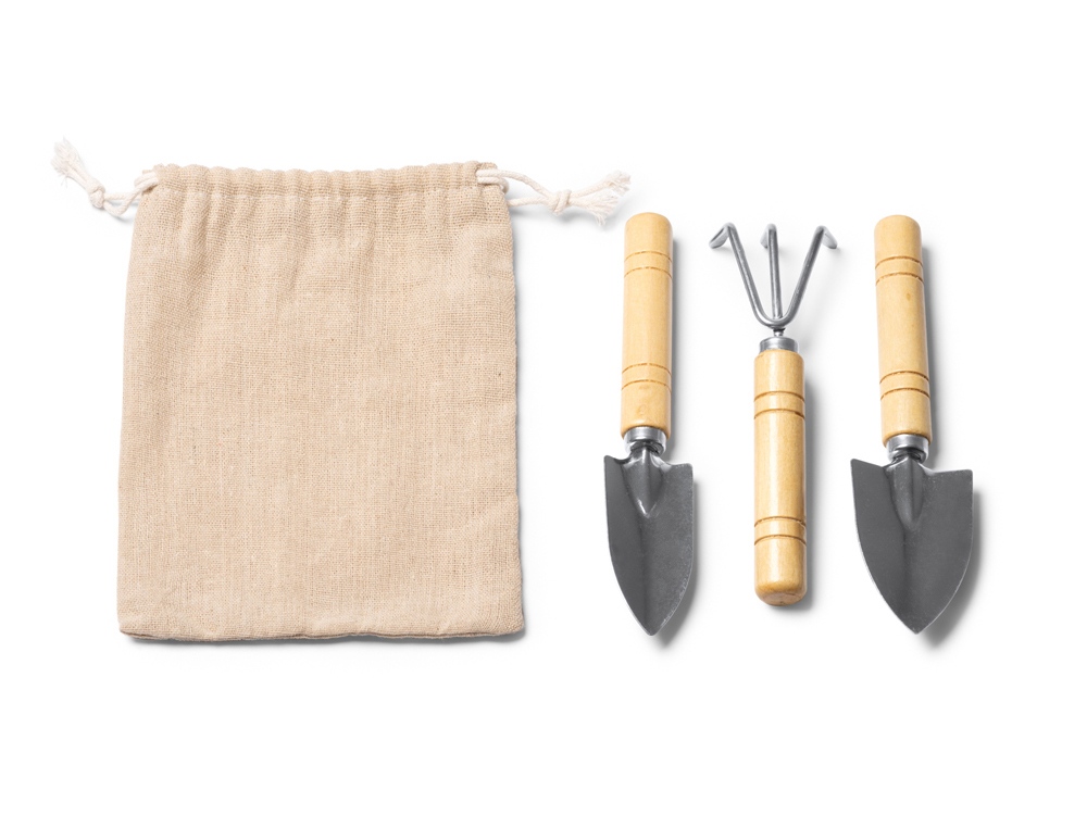 Садовый набор из 3 аксессуаров из нержавеющей стали с бамбуковыми ручками. Включает большую и малую лопатки и грабли. В комплект входит хлопковый мешочек.