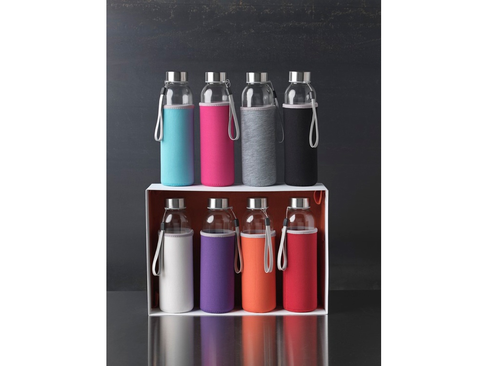 Стеклянная бутылка с одинарными стенками и съемной крышкой. На крышке есть ремешок для легкой переноски, кроме того имеется чехол из неопрена. Рекомендуется использовать для холодных напитков. Не замораживать, не разогревать в микроволновой печи. Объем 500 мл. Уложена в подарочную коробку.