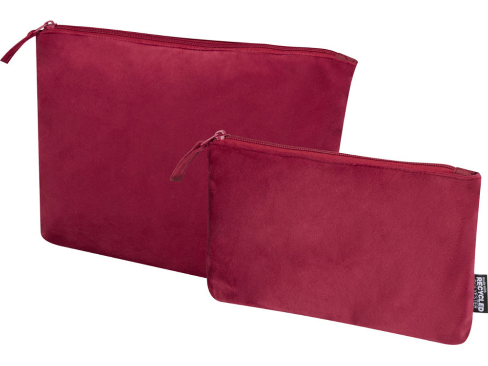 Набор из 2 косметичек, изготовленных из переработанного бархатного полиэстера. Полиэстер имеет сертификат GRS. В комплект входят одна большая и одна маленькая косметички. Легкие, прочные и удобние для хранения косметики или электроники. Большая сумка имеет размер 32 х 21 см, а маленькая 23 х 13 см.