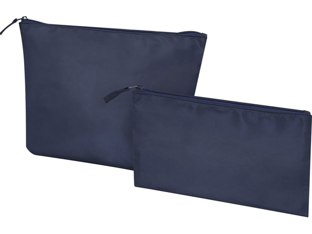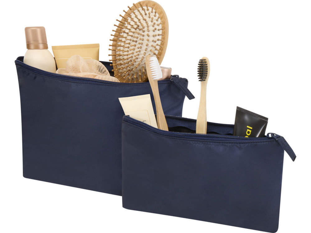 Набор из 2 косметичек, изготовленных из переработанного полиэстера. Полиэстер имеет сертификат GRS. В комплект входят одна большая и одна маленькая косметички. Легкие, прочные и удобние для хранения косметики или электроники. Большая сумка имеет размер 32 х 21 см, а маленькая 23 х 13 см.