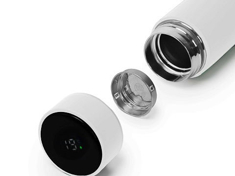 Термос из нержавеющей стали, покрытый цветным soft touch, с крышкой, в которой встроен термометр и LED дисплей, показывающий температуру внутри термоса. Объем: 500 мл. Упаковка: каждый термос в крафт коробке.