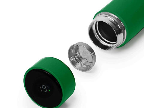 Термос из нержавеющей стали, покрытый цветным soft touch, с крышкой, в которой встроен термометр и LED дисплей, показывающий температуру внутри термоса. Объем: 500 мл. Упаковка: каждый термос в крафт коробке.