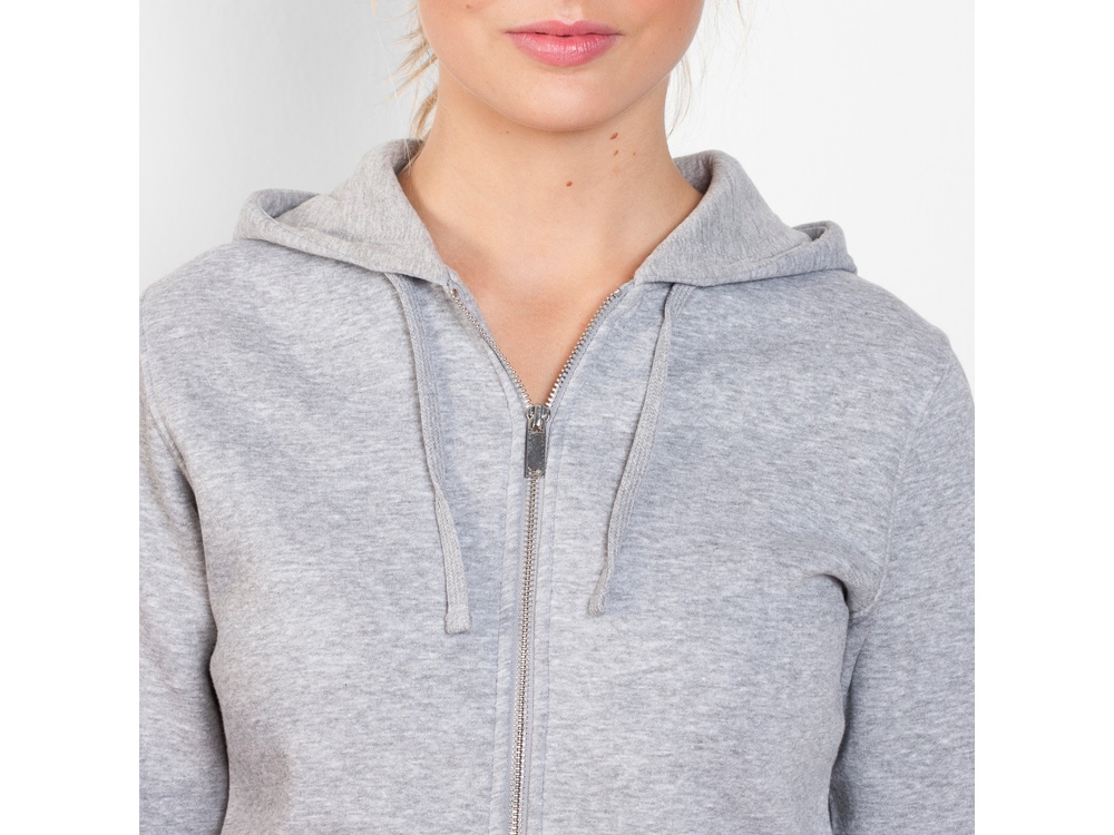 Женская толстовка на молнии с капюшоном на подкладке в тон. - Металлическая центральная молния. - Карман-кенгуру. - Усиленные закрытые внутренние швы горловины. - Манжеты рукавов и низ из риба 2 x 2. - Приталенный крой.