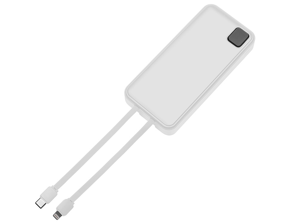 Удобный внешний аккумулятор с функцией быстрой зарядки и встроенными кабелями USB-C (симметричный разъём USB тип С) и Lightning (разъём в ранних версиях iPhone) — ваш надежный партнер в путешествиях, на встречах и в повседневных задачах. Цифровой дисплей в реальном времени показывает точный остаток заряда и статус быстрой зарядки, а встроенные кабели и несколько разъемов позволяют заряжать до 4 устройств. Прочный корпус из переработанного АБС-пластика и емкость 20000 мАч обеспечивают зарядом все ваши устройства на долгий срок. Идеальный выбор для тех, кто ценит комфорт и функциональность в одном устройстве. Продуманная упаковка: для открытия просто потяните за язычок, и появится гаджет с нанесением. - Встроенные кабели USB-C и Lightning — больше не нужно искать провода - Цифровой дисплей с точным отображением заряда - Удобная зона под нанесение логотипа - Функция быстрой зарядки, заряжает на 50% быстрее - Упаковка с удобным и быстрым открытием - До 4-5 полных зарядок смартфона